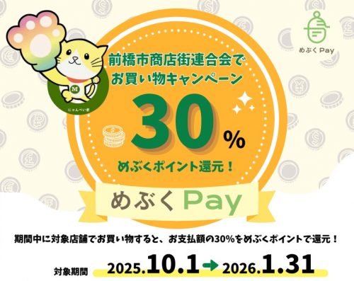 2025年10月1日から2026年1月31日まで、めぶくPay をご利用の全ユーザー様にて期間中に対象店舗でお買い物をすると、お支払額の30%をめぶくポイントで還されるキャンペーンを行っています!!