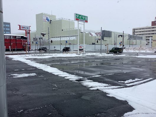 お店の駐車場は一面雪に覆われているかと思いきや、
